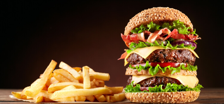 4 hamburgers di manzo da 150 gr. cad. sovrapposti - cipolla caramellizzata, bacon croccante, cheddar, edamer, insalata, salse thousand island